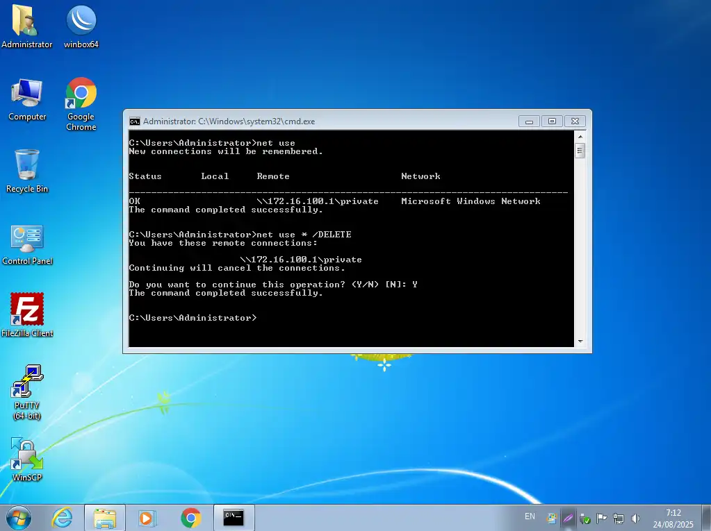 Langkah terakhir kita dapat logout atau mengakhiri koneksi dengan samba server dengan menggunakan perintah net use