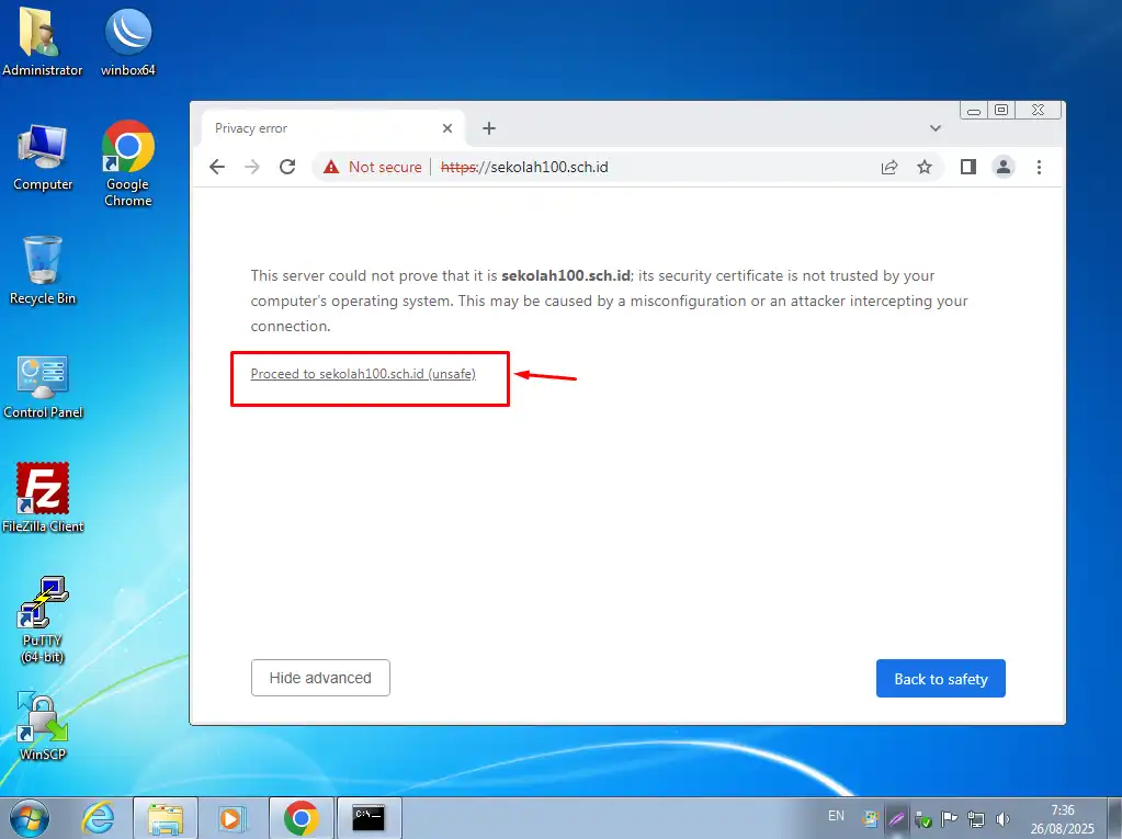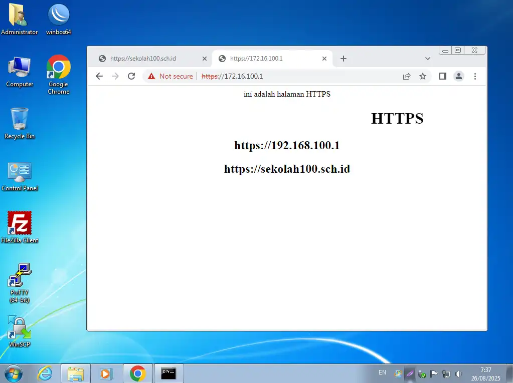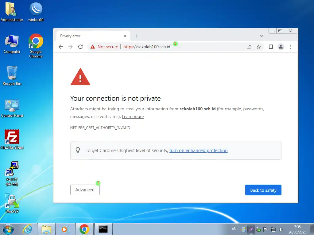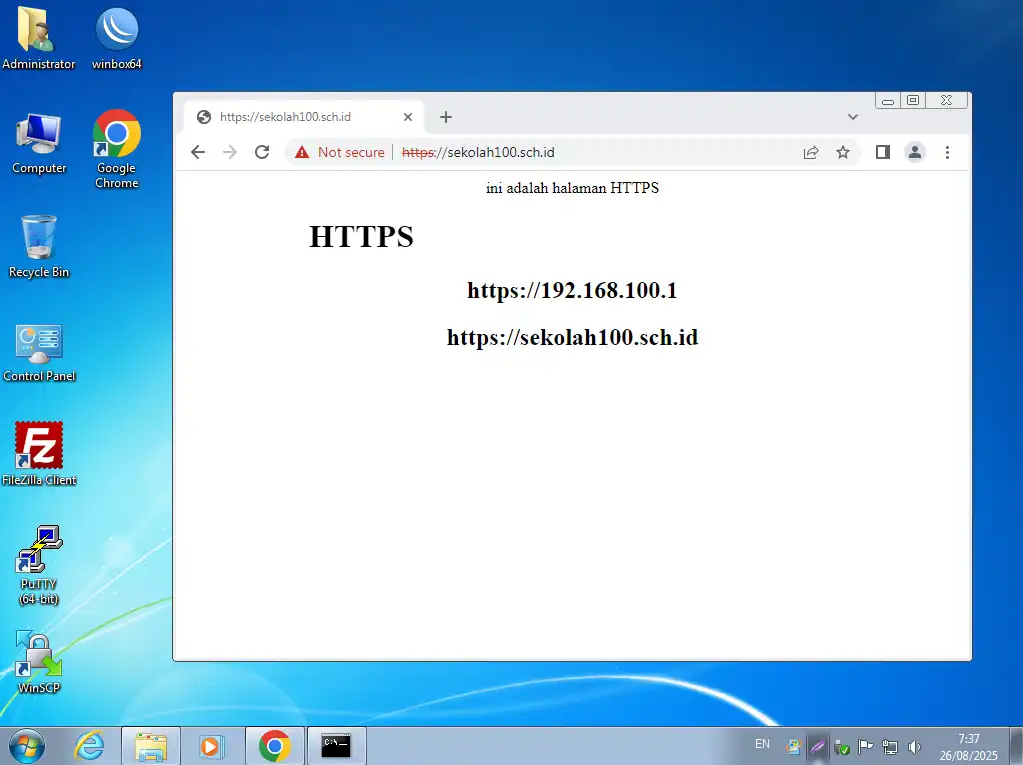 root@ns100:/etc/apache2/sites-available# a2enmod ssl Considering dependency setenvif for ssl: Module setenvif already enabled Considering dependency mime for ssl: Module mime already enabled ... To activate the new configuration, you need to run: systemctl restart apache2 root@ns100:/etc/apache2/sites-available# a2ensite sekolah100-ssl.conf Enabling site sekolah100-ssl. To activate the new configuration, you need to run: systemctl reload apache2 root@ns100:/etc/apache2/sites-available# /etc/init.d/apache2 restart Restarting apache2 (via systemctl): apache2.service.