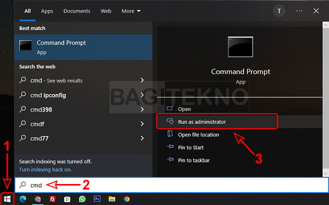 - Buka CMD sebagai admin dengan cara klik Start, lalu cari “cmd”, kemudian klik Run as administrator.