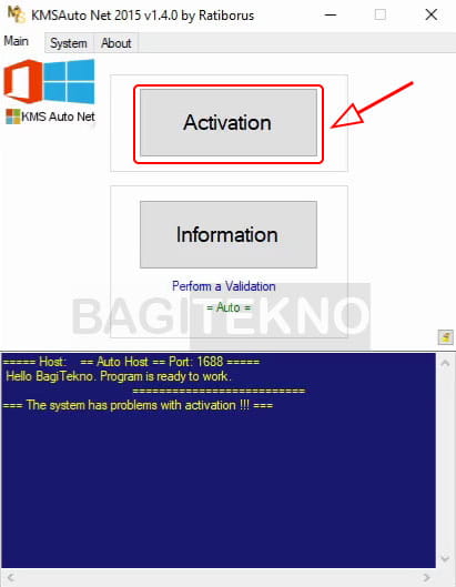 - Selanjutnya, pada aplikasi KMSAuto Net yang terbuka, klik tombol Activation.
