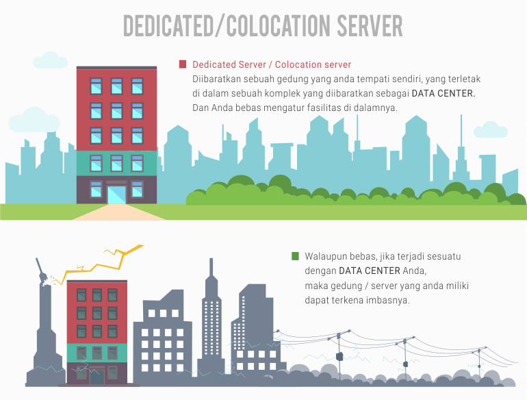 Dedicated server dan Colocation Server sebenarnya merupakan server yang sama, yang membedakan adalah komponen hardware Dedicated Server menyewa milik datacenter, sedangkan Colocation server, server fisik dan semua komponennya dibeli sendiri, mulai dari hardware, software, firewall hingga komponen lainnya dan diletakkan di data center untuk dikelola & dirawat. Pengguna memiliki root access server dan memiliki wewenang penuh memanajemen server-nya. Untuk mengelola Dedicated dan Colocation Server, Anda juga membutuhkan pengetahuan tentang server. Bila diibaratkan Dedicated Server maupun Colocation server adalah sebuah gedung yang Anda tempati sendiri. Anda bebas menggunakan dan mengatur segala fasilitas didalamnya. Gedung ini terletak di sebuah kompleks yang disebut data center. Walaupun bebas, jika terjadi sesuatu dengan data center Anda maka gedung/server yang Anda miliki dapat terkena imbasnya misalnya mati listrik atau bencana alam.