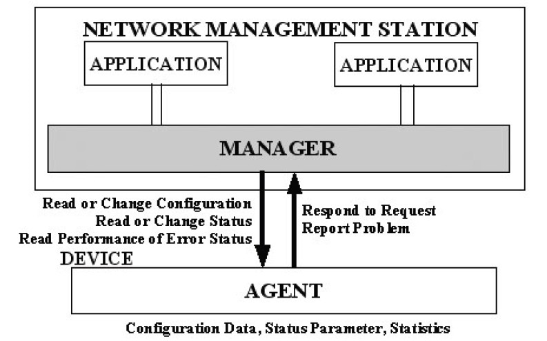 Sebuah software agent perlu di-install pada masing-masing peralatan jaringan. Agent tersebut menerima pesan dari manajer jaringan. Pesan tersebut umumnya berupa permintaan (request) untuk membaca data dari peralatan jaringan atau menulis data ke peralatan jaringan. Selanjutnya si agent mengurus request tersebut dan memberikan respons balik ke manajer jaringan.