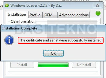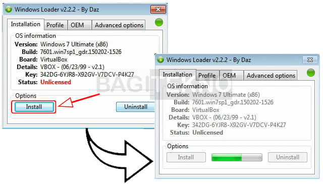 - Setelah Windows Loader terbuka, klik tombol Install untuk memulai aktivasi Win 7.