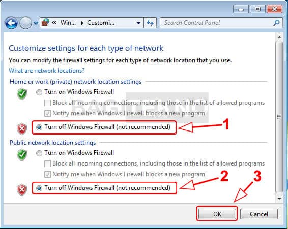 Setelah itu, pergi ke Control Panel > System And Security > Windows Firewall lalu klik Turn on Windows Firewall on or off pada panel sebelah kiri. Kemudian, klik opsi Turn off Windows Firewall (not recomended) baik pada Home or work (private) network location settings maupun pada bagian Public network location settings.