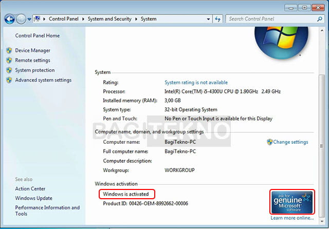 Jika Windows 7 sudah aktif, maka keterangan Windows activation akan berubah menjadi Windows is activated. Selain itu, akan muncul juga gambar logo genuine yang artinya Windows 7 anda sudah teraktivasi genuine dan permanen.