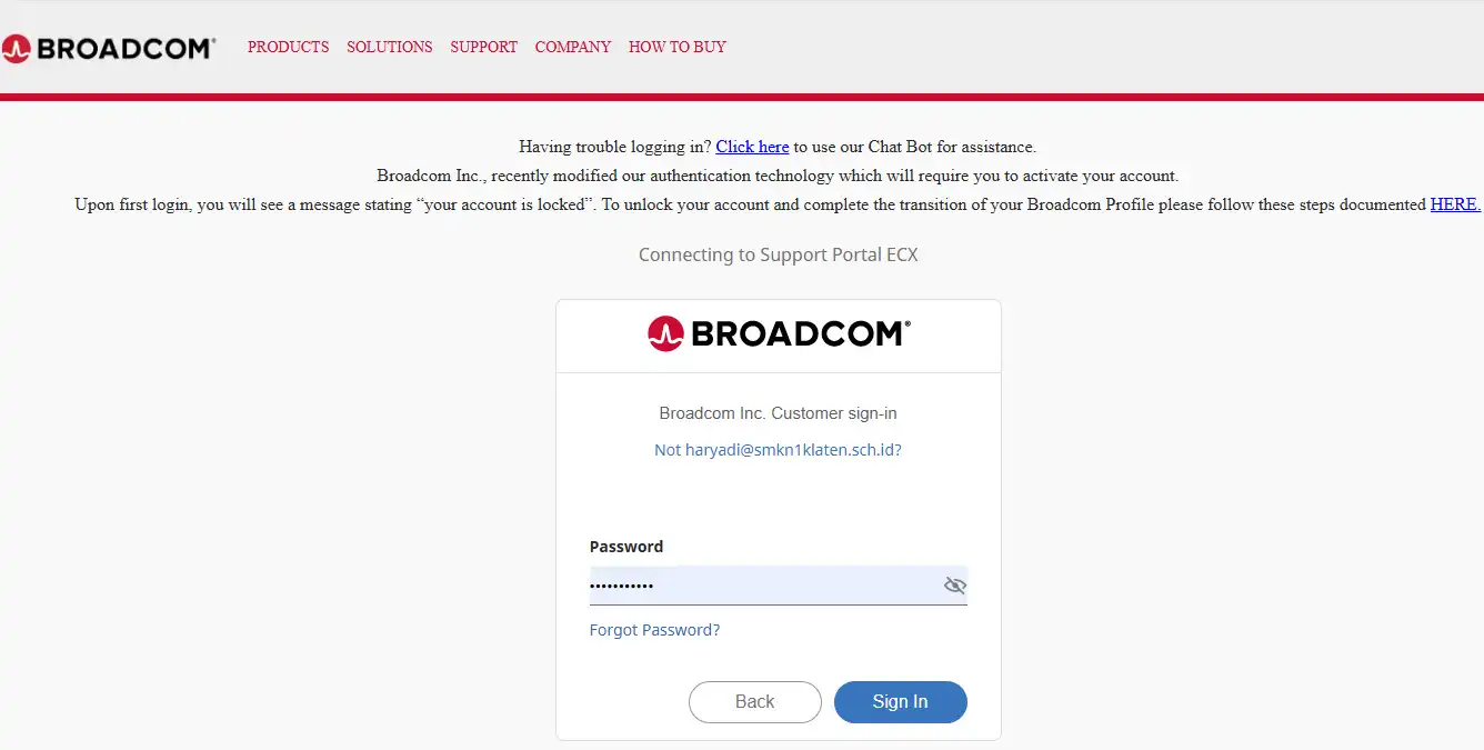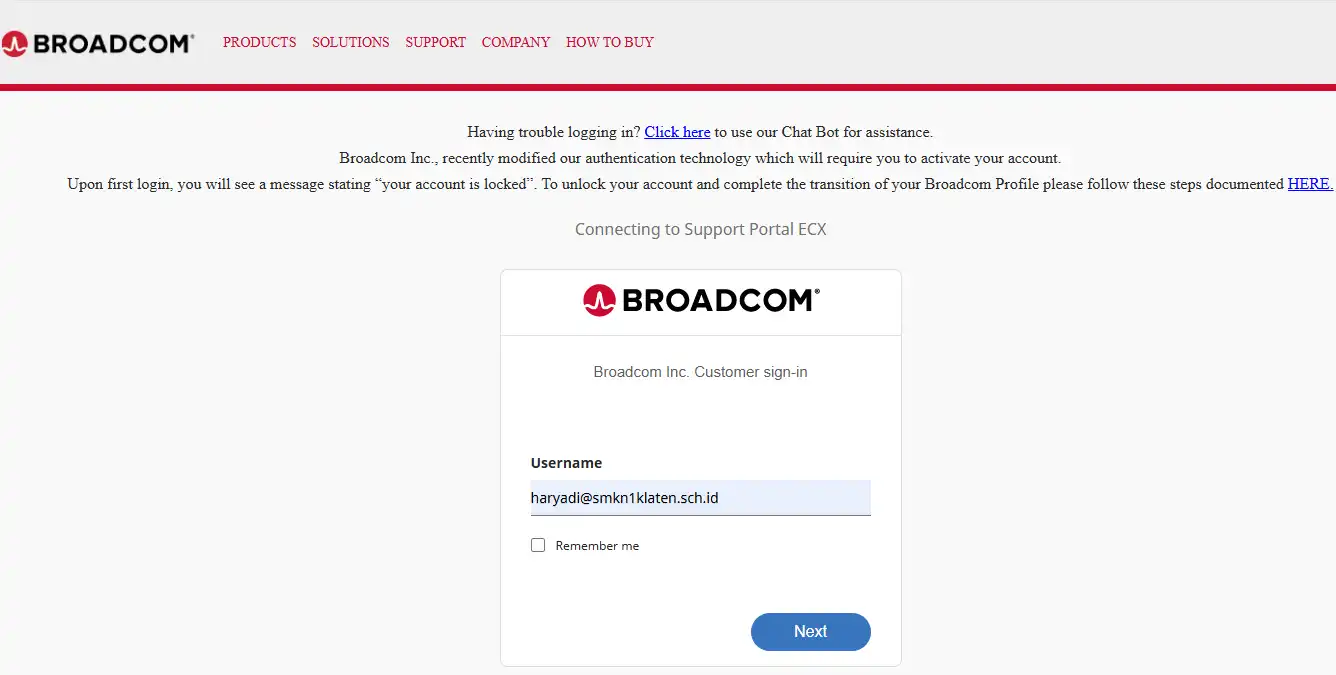 Selanjutnya Anda akan di bawa ke halaman login Broadcom inc. Jika Anda belum mempunyai akun silahkan untuk register atau membuat akun terlebih dahulu. Jika sudah memiliki akun silahkan isikan Username Anda, kemudian klik tombol Next
