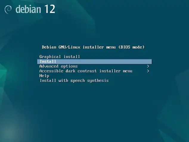 Masukkan CD instalasi jaringan Debian 12 (Bookworm) ke dalam sistem (atau USB yang telah berisi file ISO) dan boot dari sana. Jika menggunakan perangkat lunak virtualisasi seperti VMware atau VirtualBox, pilih file ISO minimal Debian 12 sebagai sumber untuk drive DVD VM. Anda tidak perlu Burning ISO ke CD atau DVD untuk langkah ini.