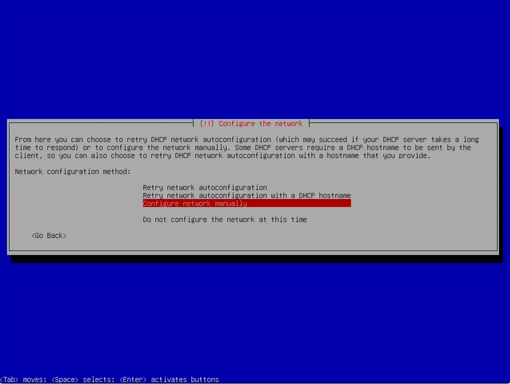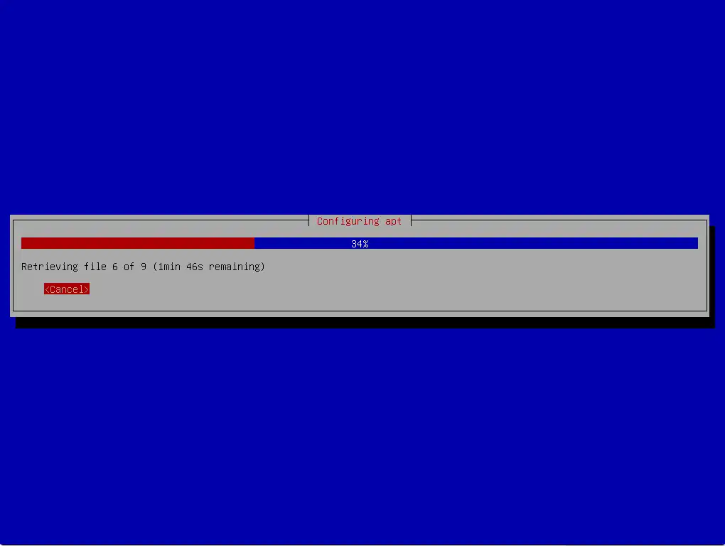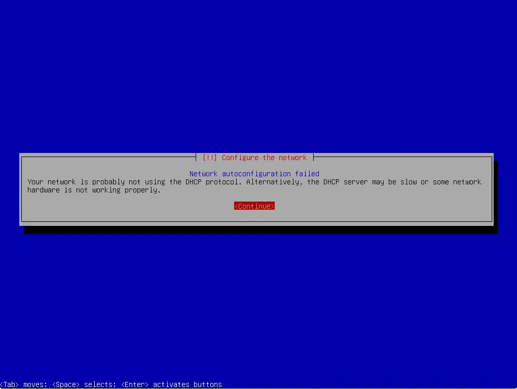 Karena kita menggunakan statik IP Address maka padaa saat proses berjalan kita tekan Cancel, sehingga mucul pesan “Network autoconfiguration failed”.