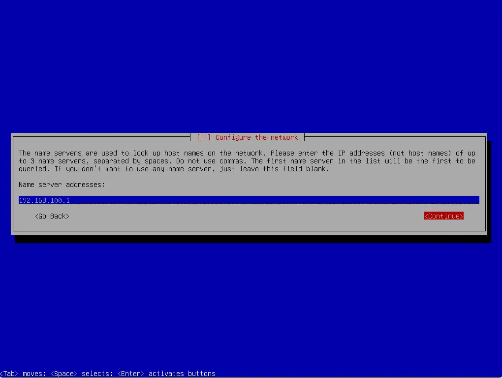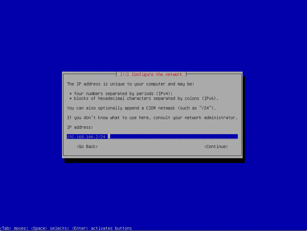 Ketik IP address untuk server ini yaitu 192.168.100.2/24. Kemudian tekan tombol <Enter> untuk menuju ke langkah berikutnya.