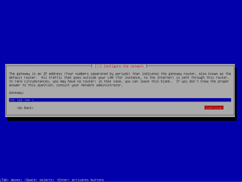 Ketik IP address gateway yaitu 192.168.100.1 tanpa tanda slash (/) CIDR, lalu tekan <Enter>