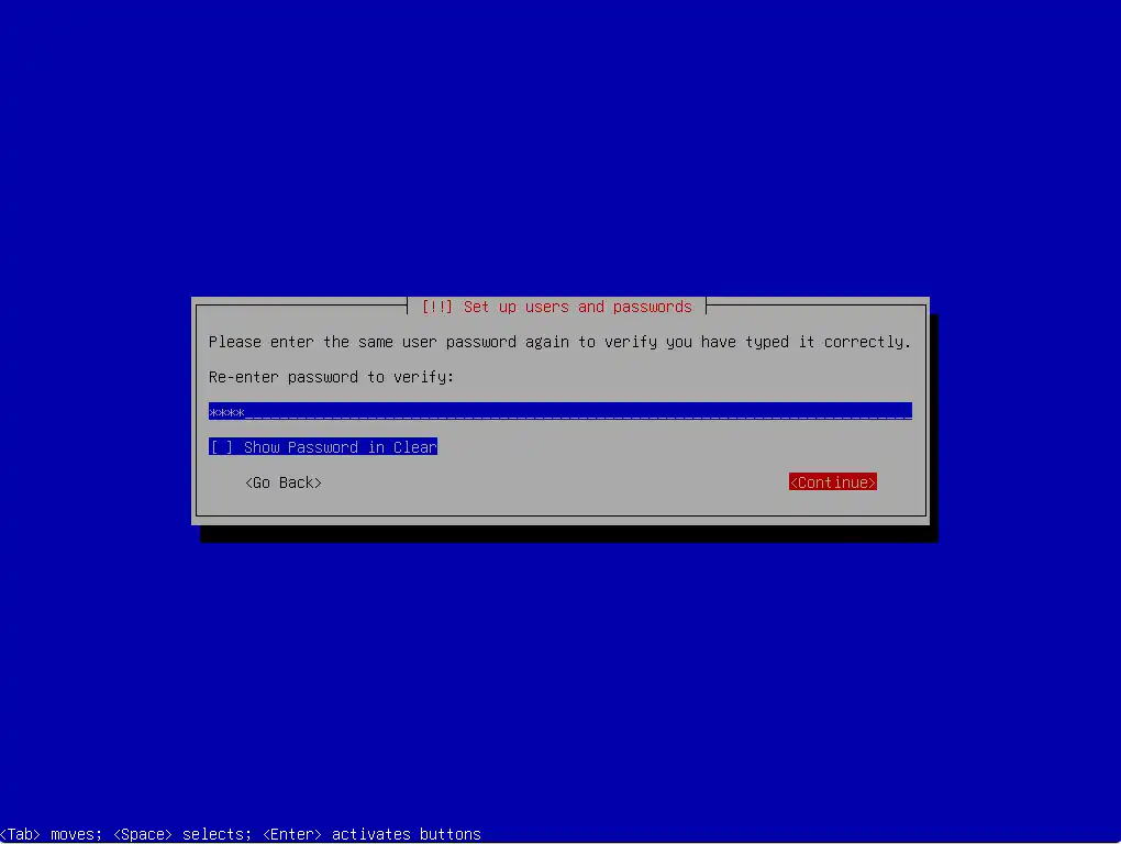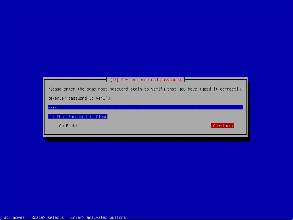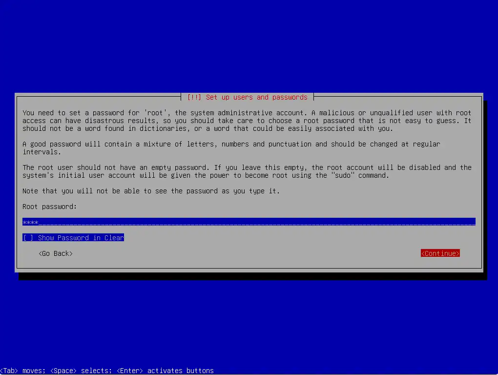 Kita perlu mengatur kata sandi untuk root (akun administratif sistem), yaitu user yang memilkik hak akses ful terhadap sistem server debian ini.