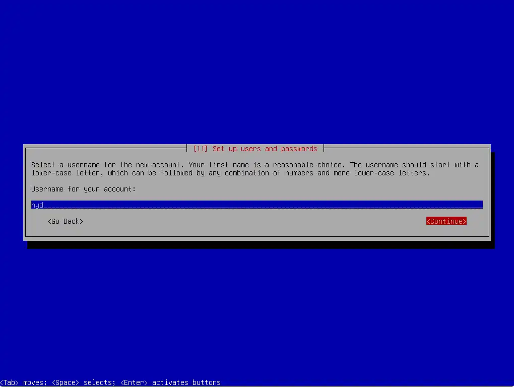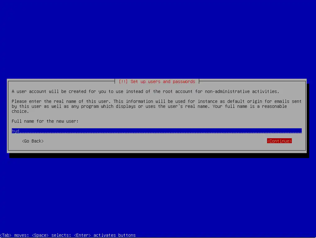 Buat akun pengguna Linux, misalnya gunakan nama atau nama panggilan Anda. Untuk contoh instalasi ini, saya akan memilih nama “hyd” dengan nama pengguna hyd (jangan gunakan nama pengguna admin, karena itu adalah nama yang telah disediakan di Debian Linux artinya nama tersebut sudah ada di sistem).