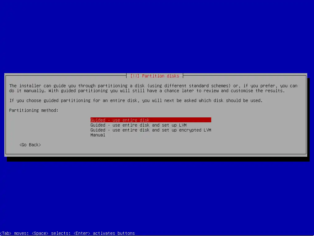 Sekarang kita akan melakuka partisi hard disk. Untuk alasan kemudahan, kita memilih Guided – use entire disk dengan memisahkan partisi /home. Opsi ini akan membuat tiga partisi yaitu partisi untuk sistem file (/), partisi swap (/swap) dan satu lagi partisi home (/home) (tentu saja, pembagian partisi sepenuhnya terserah kita – jika kita tahu apa yang kita lakukan, kita juga bisa mengatur partisi secara manual).