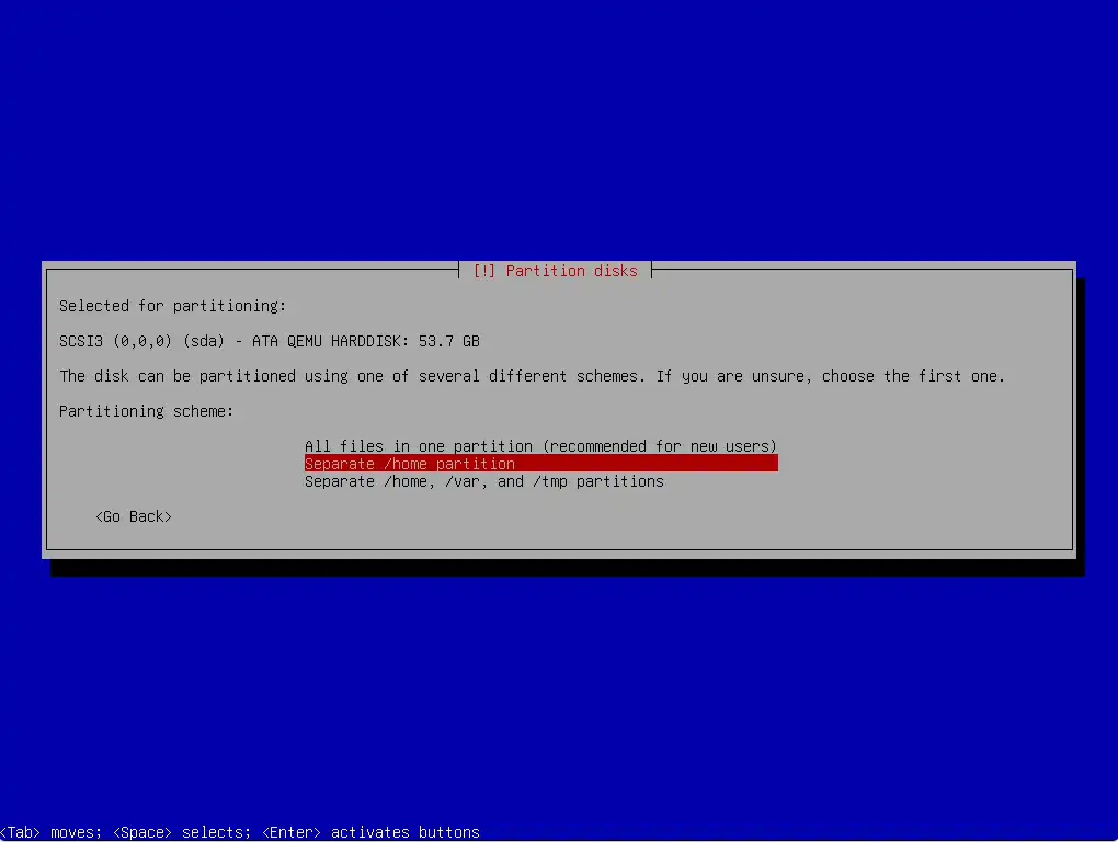 Kemudian pilih skema partisi. Seperti yang disebutkan sebelumnya, kita memilih Separate /home partition.