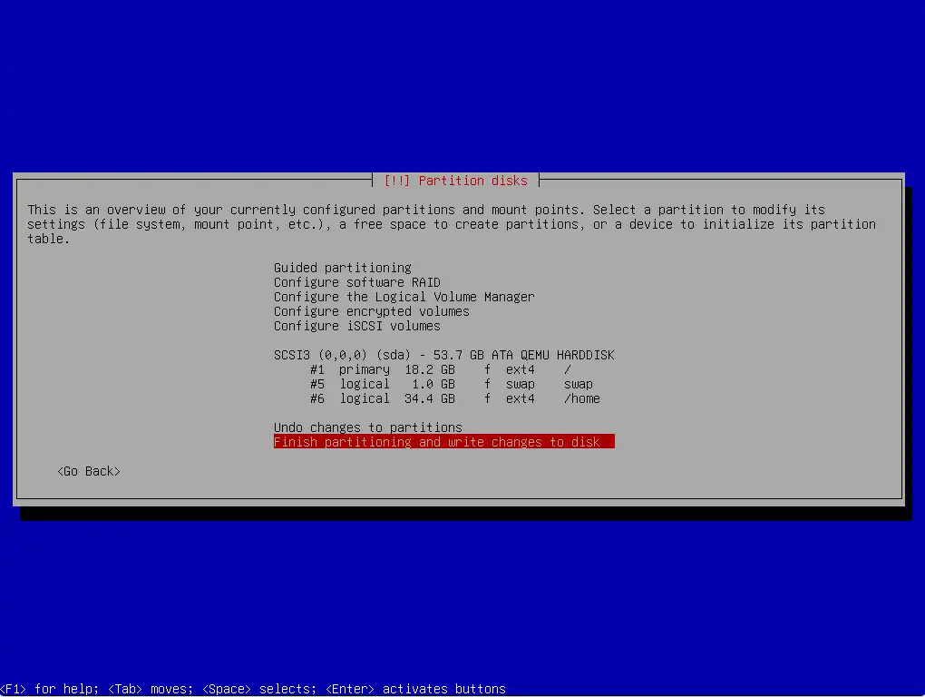 Setelah selesai, pilih Finish partitioning and write changes to disk