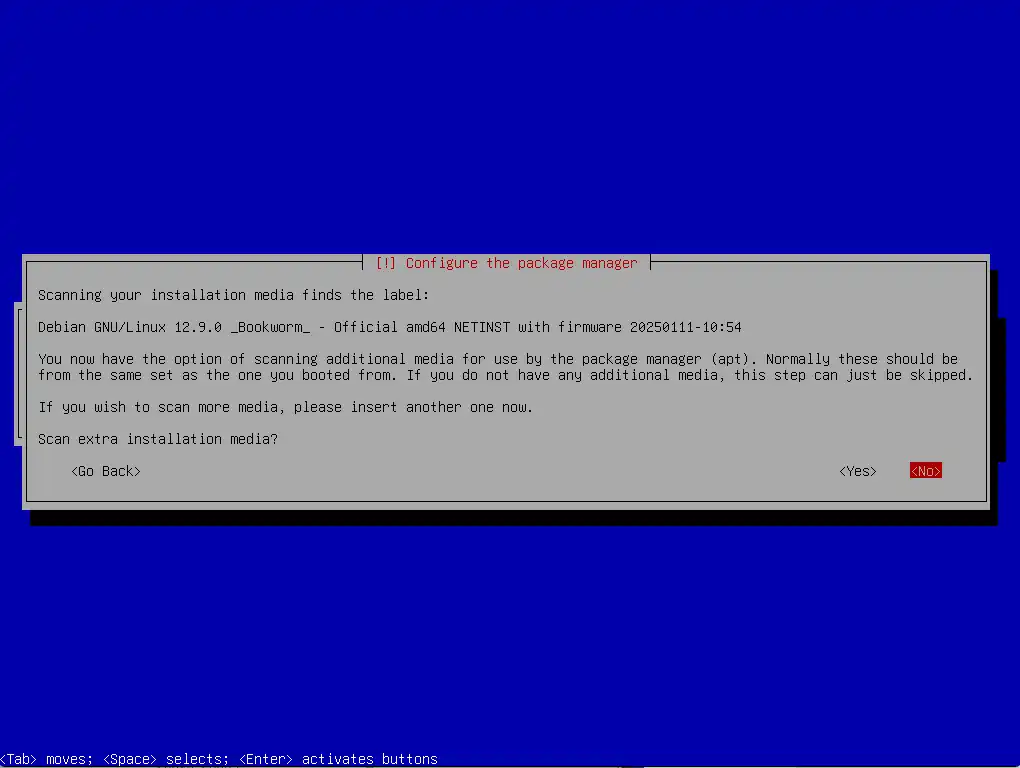 Tampilan seperti layar berikut mungkin akan muncul, tergantung pada media instalasi yang kita gunakan. Kita akan melakukan instalasi berbasis jaringan (semua paket tambahan akan diunduh dari internet), jadi kita memilih untuk tidak memindai disk instalasi tambahan.