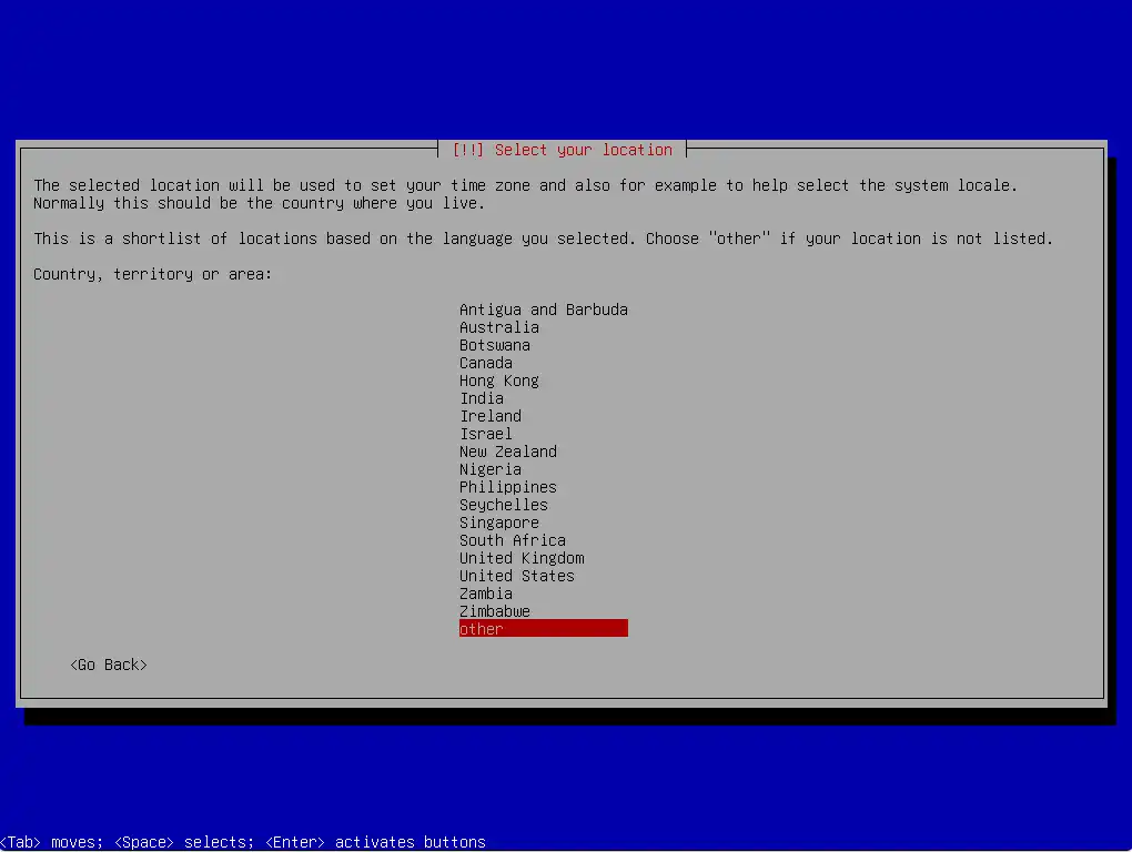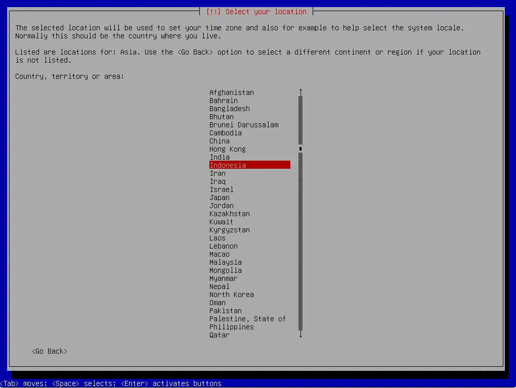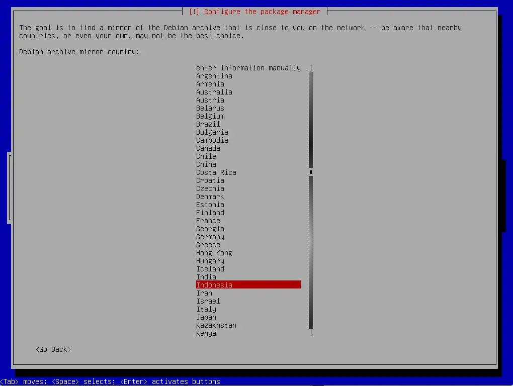 Selanjutnya, kita harus mengkonfigurasi APT. Karena kita menggunakan Debian Netinstall CD, yang hanya berisi paket minimal, maka kita harus menggunakan network mirror. Pilih negara tempat network mirror yang ingin kita gunakan berada (biasanya, ini adalah negara di mana sistem server kita berada).