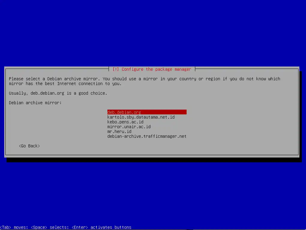 Pilih network mirror (contoh: deb.debian.org) yang ingin kita gunakan, lalu tekan Enter