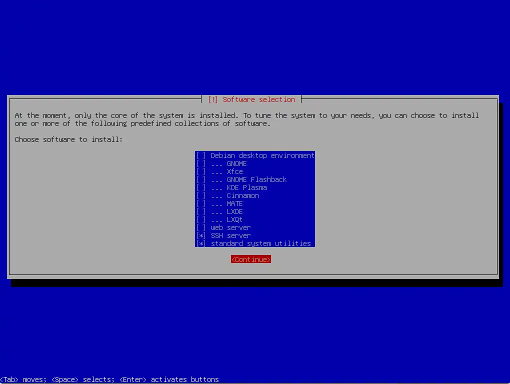 Kita akan memilih Standard system utilities dan SSH server (agar nantinya dapat langsung terhubung ke sistem dengan klien SSH seperti PuTTY setelah instalasi selesai).