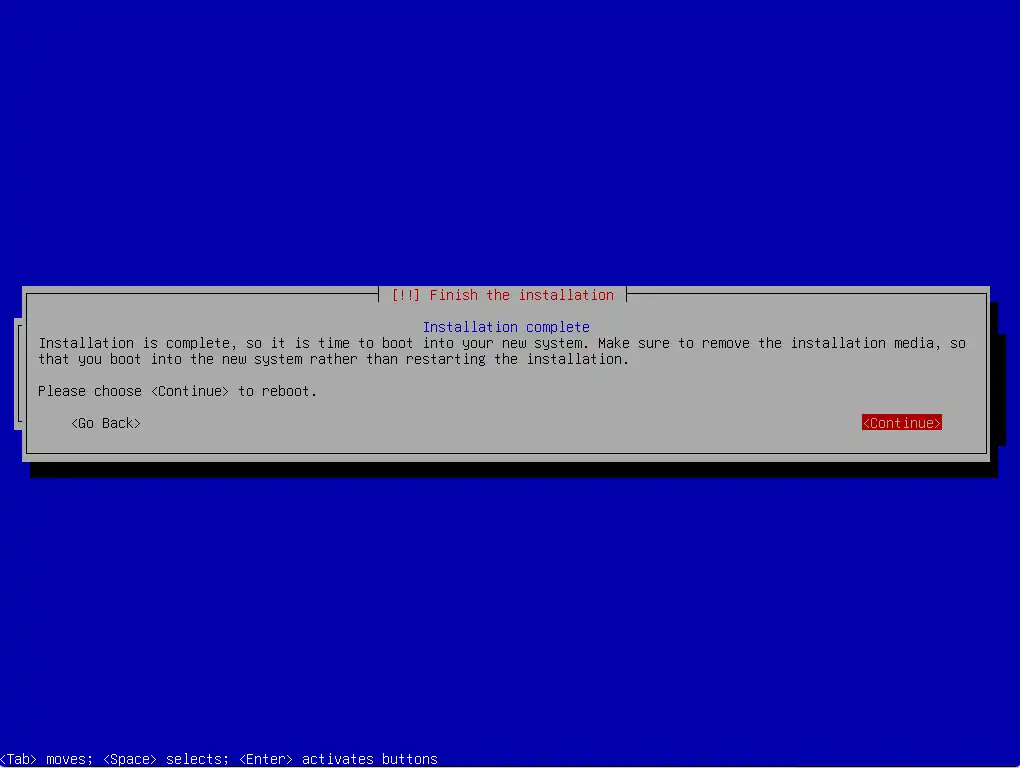 Instalasi selesai. Keluarkan Debian Netinstall CD dari drive CD dan tekan Continue untuk me-reboot sistem.