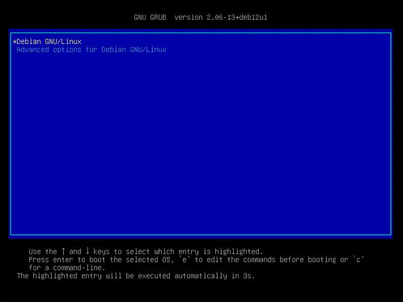 Boot pertama dari server Debian 12 yang baru diinstal, kita akan melihat layar boot GRUB Boot Loader, tekan Enter atau tunggu beberapa detik, maka proses boot akan berlanjut secara otomatis.