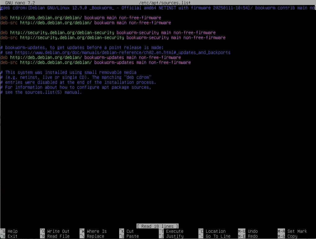 Pertama, pastikan bahwa file /etc/apt/sources.list berisi repositori bookworm-updates (hal ini memastikan bahwa server selalu mendapatkan pembaharuan terbaru) dan bahwa repositori contrib, non-free, serta non-free-firmware sudah diaktifkan.