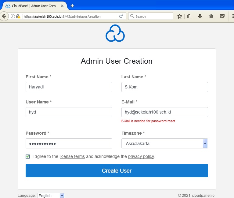 Selanjutnya kita buka browser untuk mengakses interface CloudPanel dengan mengetikan alamat https://sekolah100.sch.id:8443. Dan kita akan diarahkan ke halaman Registerasi user Admin, kemudian kita isi dan lengkapi (First Name, Last Name, User Name Admin, E-mail dan Password) dan klik tombol “Create User”. Maka kita akan diarahkan ke halaman login CloudPanel.