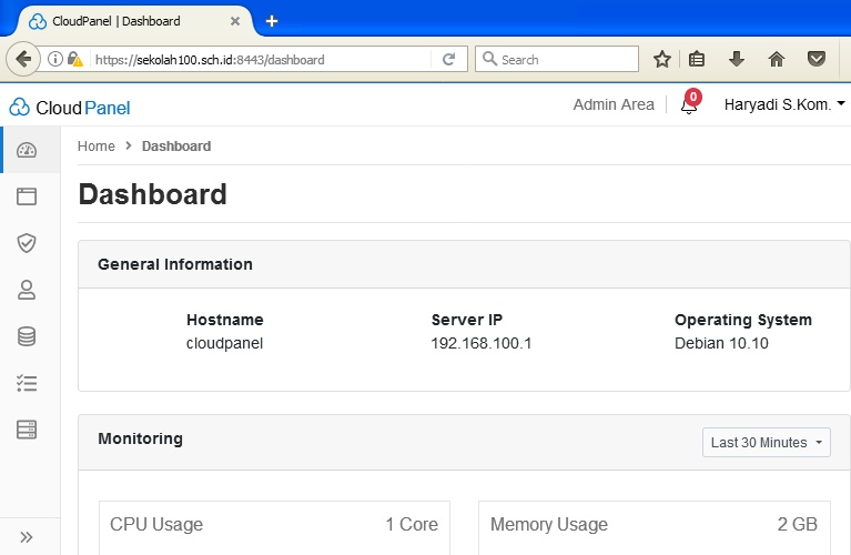 Ketikkan user admin yang telah kita buat sebelumnya, isikan password-nya dan klik tombol “Login”. Dan dashboard CloudPanel akan tampil di layar.