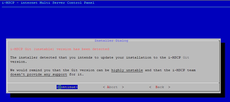cd /usr/local/src git clone https://github.com/i-MSCP/imscp.git Cloning into 'imscp'... remote: Enumerating objects: 252617, done. remote: Counting objects: 100% (193/193), done. remote: Compressing objects: 100% (110/110), done. remote: Total 252617 (delta 96), reused 160 (delta 79), pack-reused 252424 Receiving objects: 100% (252617/252617), 242.04 MiB | 2.28 MiB/s, done. Resolving deltas: 100% (170739/170739), done. Checking out files: 100% (1270/1270), done. cd imscp/ apt -y update apt -y upgrade