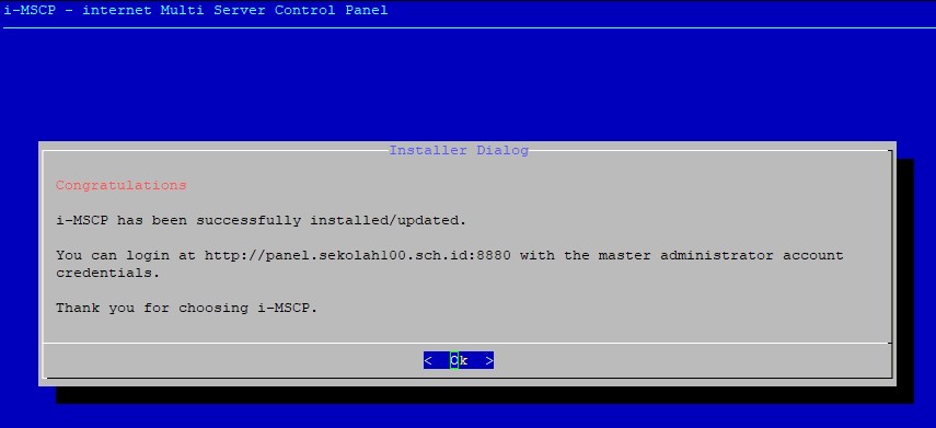 Selamat! akhirnya kita telah belajar dan berhasil menginstal Control Panel i-MSCP di Debian 10 (Buster). Dengan Control Panel i-MSCP kita dapat mengelola user, Domain, Web Server, PHP, Redis, dan Resources server dengan mudah. Semoga bermanfaat