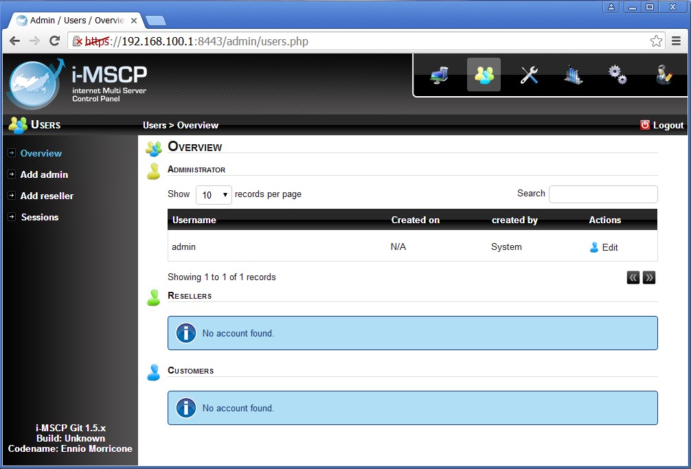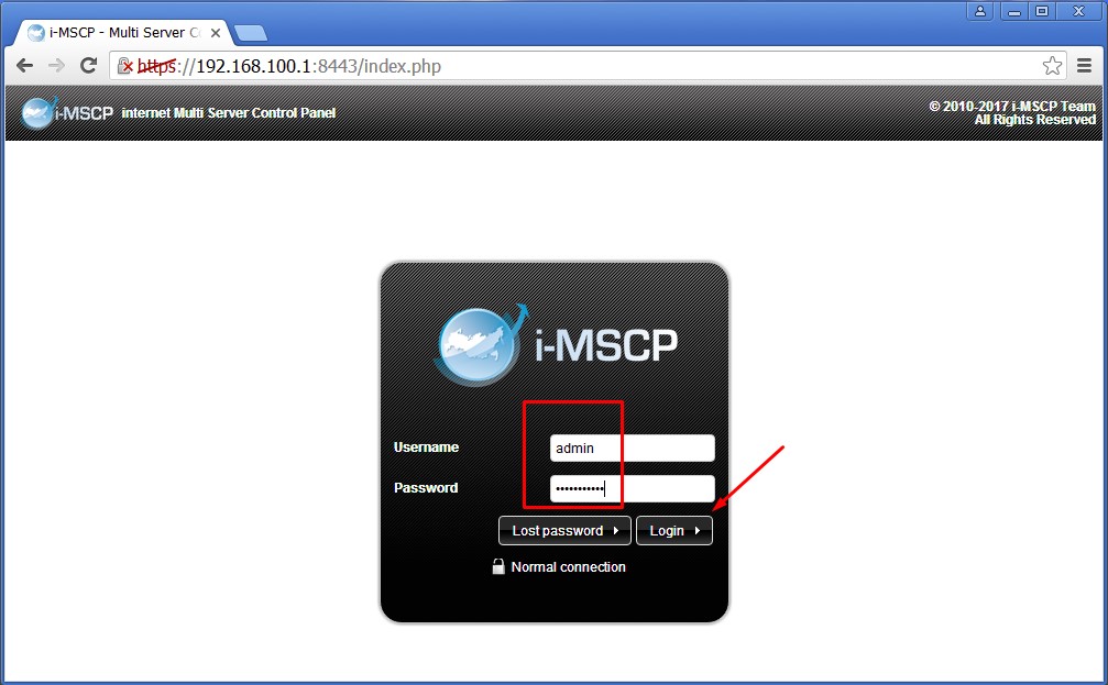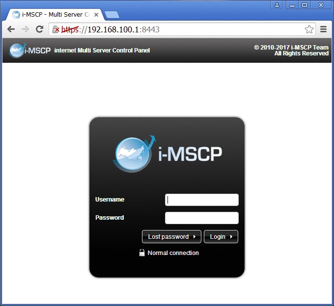 Selanjutnya kita buka browser untuk mengakses interface i-MSCP dengan mengetikan alamat https://192.168.100.1:8443/. Dan kita akan diarahkan ke halaman log-in i-MSCP.