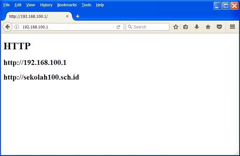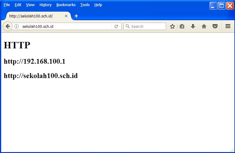 root@ns100:/etc/apache2/sites-available# mkdir /var/www/html/http root@ns100:/etc/apache2/sites-available# nano /var/www/html/http/index.html <p><h1>HTTP</h1></p> <p><h2>http://192.168.100.1</h2></p> <p><h2>http://sekolah100.sch.id</h2></p>