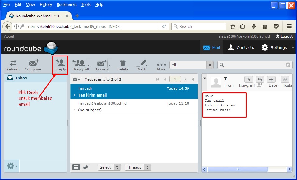 User siswa100 membalasa kiriman email dari user haryadi menggunakan menu Reply