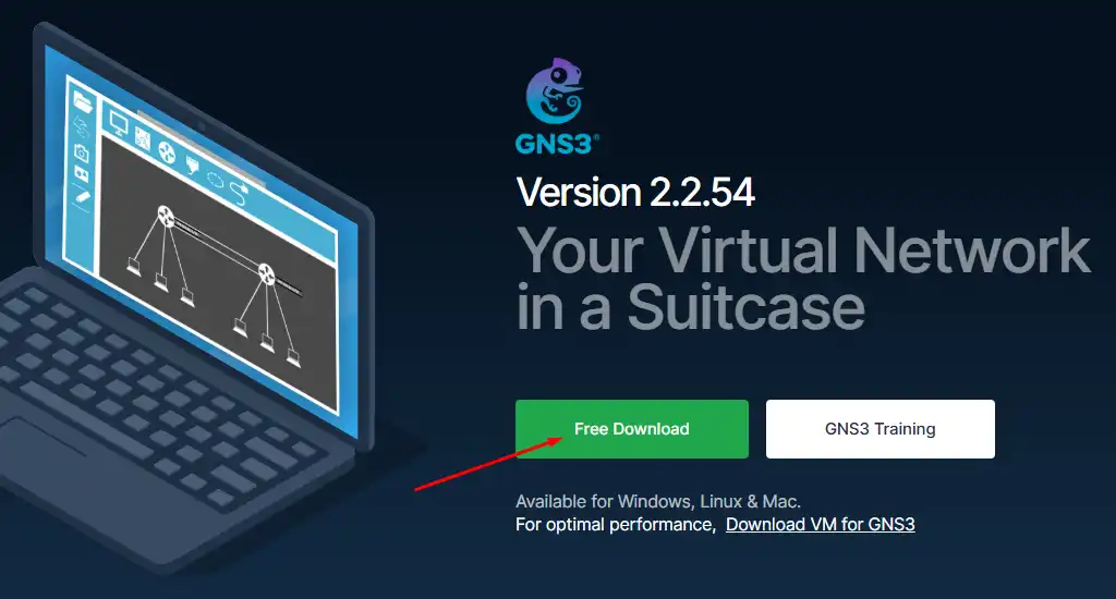 Ikuti langkah-langkah berikut ini untuk mengunduh GNS3. Gunakan web browser, buka alamat https://gns3.com/software dan klik tombol Free Download