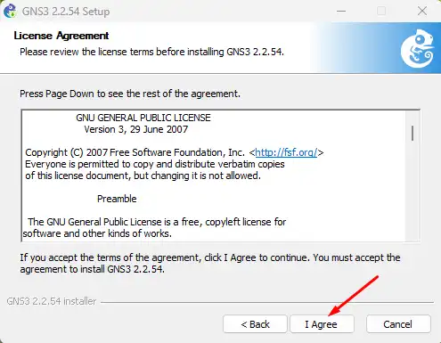 GNS3 adalah perangkat lunak sumber terbuka gratis yang didistribusikan di bawah Lisensi Publik Umum GNU Versi 3. Baca perjanjian lisensi, dan jika Anda setuju dengan isinya, klik tombol I Agree untuk melanjutkan instalasi