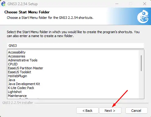 Pilih folder Start Menu untuk shortcuts GNS3. Default nama bawaannya adalah folder GNS3. Dan Anda bisa mengubahnya jika mau. Klik Next untuk melanjutkan instalasi