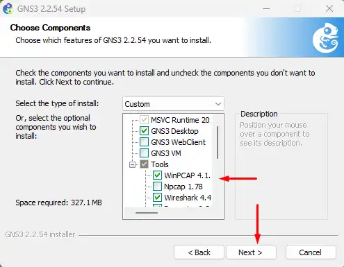 GNS3 hadir dengan berbagai perangkat lunak prasyarat dan opsional. Secara bawaan, sebagian besar perangkat lunak dipilih untuk diinstal, tetapi Anda dapat memutuskan untuk hanya menginstal perangkat lunak tertentu saja. Pilih WinPCAP dan hilangkan Npcap kemudian klik NEXT untuk melanjutkan