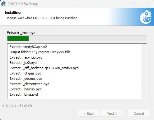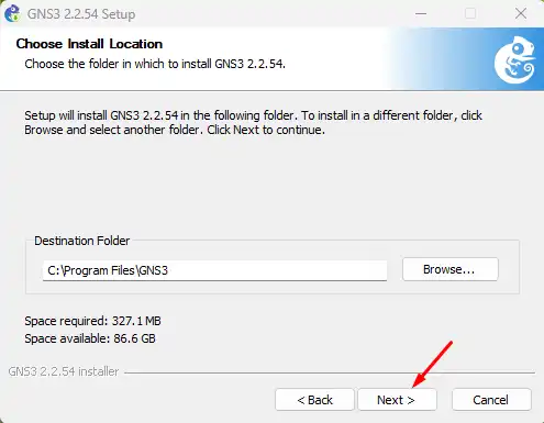 Pilih lokasi instalasi. Lokasi bawaannya adalah C:Program FilesGNS3. Kemudian klik Install