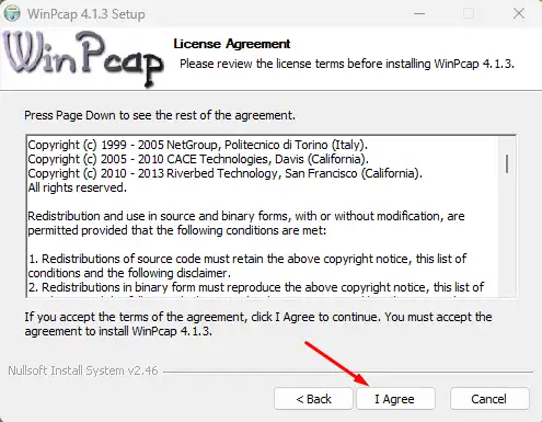 Baca perjanjian Lisensi WinPcap dan jika Anda setuju, klik tombol I Agree untuk melanjutkan.