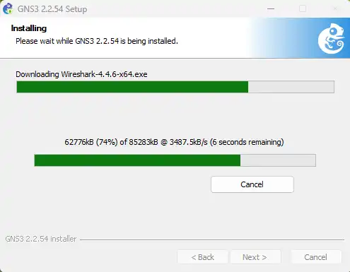 Instalasi Wireshark, GNS3 akan mengunduh file instalasi Wireshark dan kemudian akan melakukan instalasi secara silent (senyap). Tunggu hingga proses nya selesai.