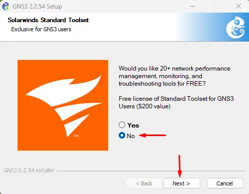 Opsional -> Jika Anda tertarik untuk menggunakan Solarwinds Standard Toolset, silahkan piliha Yes, Ini adalah evaluasi gratis (nilai $200).