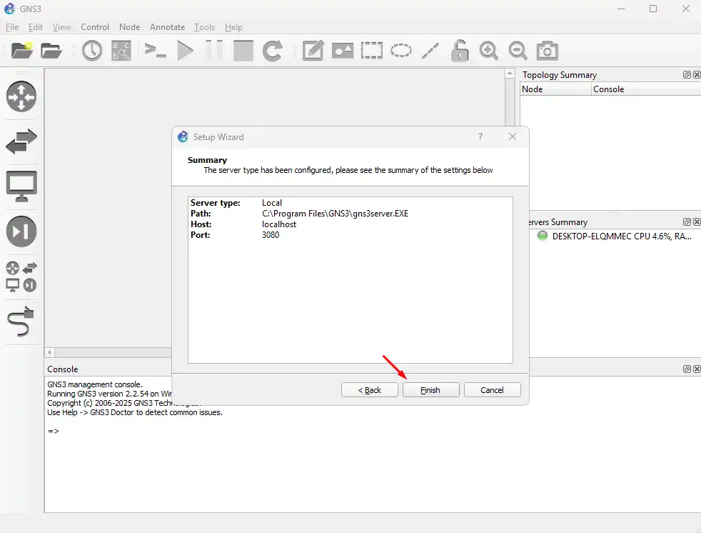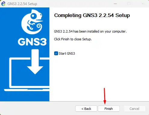 Selamat! Anda telah berhasil menginstal GNS3. Biarkan kotak centang Start GNS3 tetap aktif dan klik Finish untuk menyelesaikan instalasi GNS3.
