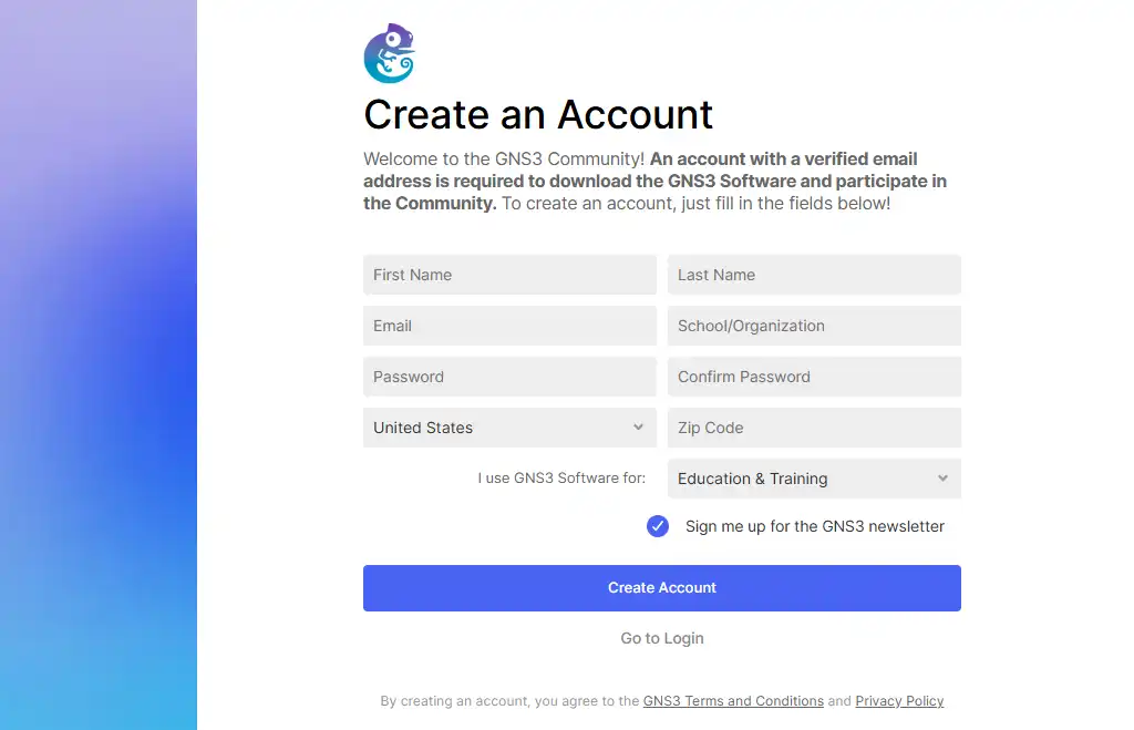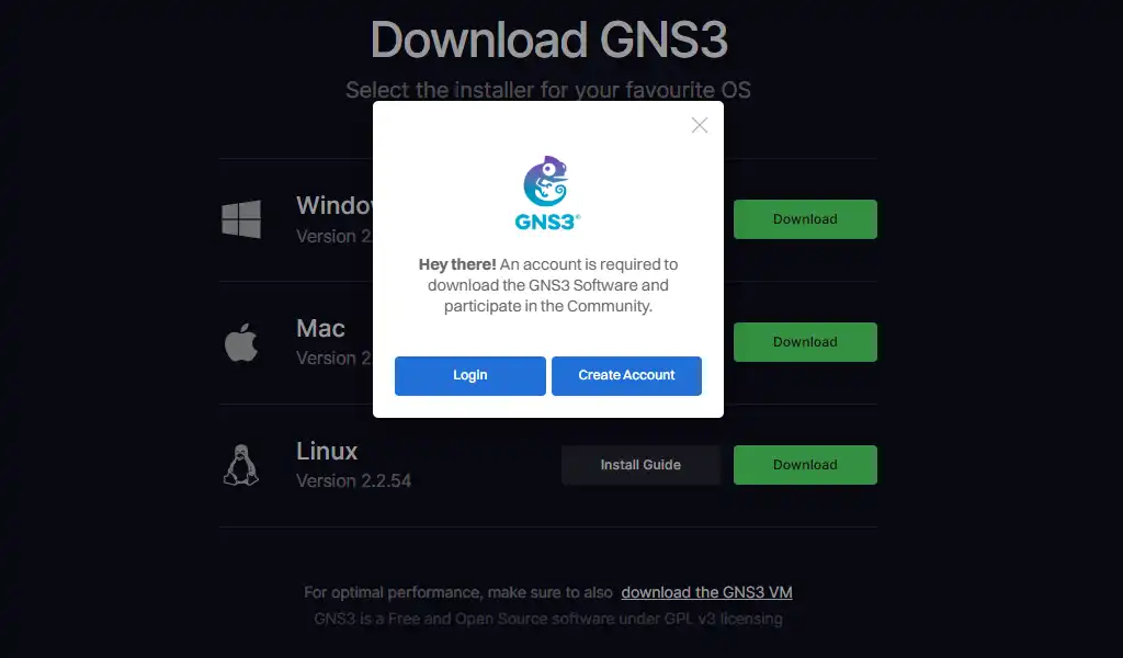 Jika kita belum terdaftar di situs GNS3, maka kita harus membuat akun terlebih dahulu untuk mendownload di GNS3. Klik tombol Create Account. Atau, jika kita sudah memiliki akun maka bisa langsung klik tombol Login