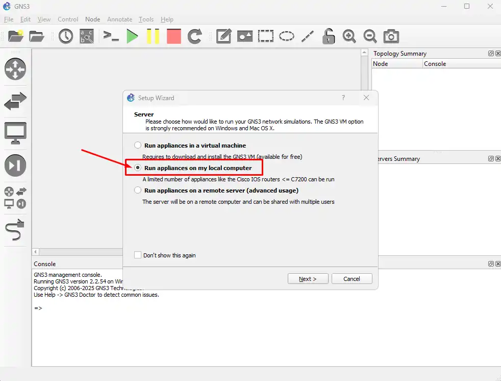 Tampilan awal aplikasi GNS3. Pilih Run Appliances on my local computer klik Next untuk melanjutkan.