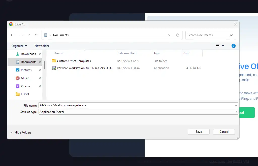 File GNS3 yang diunduh adalah file executable Windows. Jika Anda mengalami masalah saat mengunduh, pastikan kebijakan keamanan Anda seperti aturan firewall dan antivirus mengizinkan pengunduhan file .exe.