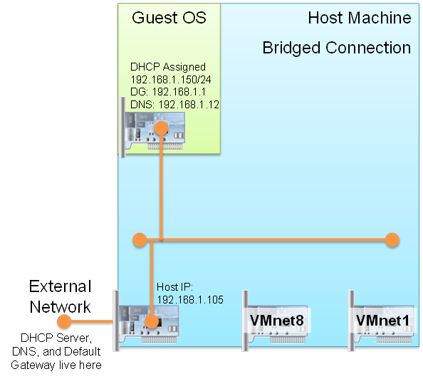 Opsi jaringan Bridged adalah yang paling mudah dipahami. Jika Anda memilih untuk menautkan Adaptor Jaringan OS tamu Anda dalam mode Bridged, antarmuka jaringan akan dibagikan dengan Host. Jika OS tamu Anda secara otomatis mendapatkan alamat IP, ia akan berada di subnet yang sama dengan host, host akan dapat melakukan ping ke tamu, dan tamu akan dapat melakukan ping ke host dan perangkat lain di subnet tersebut secara langsung. Perangkat lain di subnet ini akan melihat tamu sebagai PC lain di jaringan dengan alamat IP dan alamat MAC sendiri.