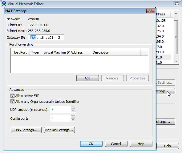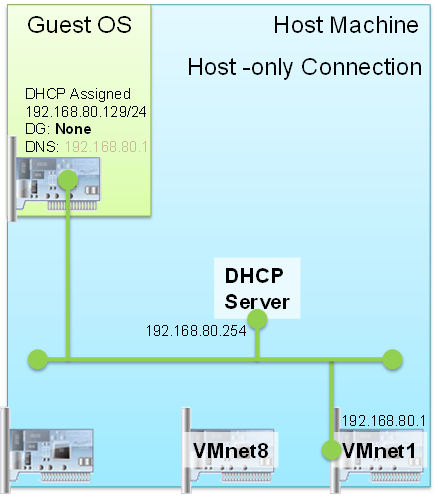 Untuk konfigurasi khusus-host, tidak ada alamat gateway default, dan tidak ada alamat DNS (meskipun server DHCP mengalokasikan alamat IP VMnetn sebagai DNS). Adaptor VMnetn Anda pada PC host akan selalu diberi alamat IP pertama yang tersedia dalam rentang IP Subnet yang ditentukan. (Hati-hati itu tidak berbenturan dengan kisaran alamat DHCP atau Anda akan mendapatkan masalah Alamat Duplikat)
