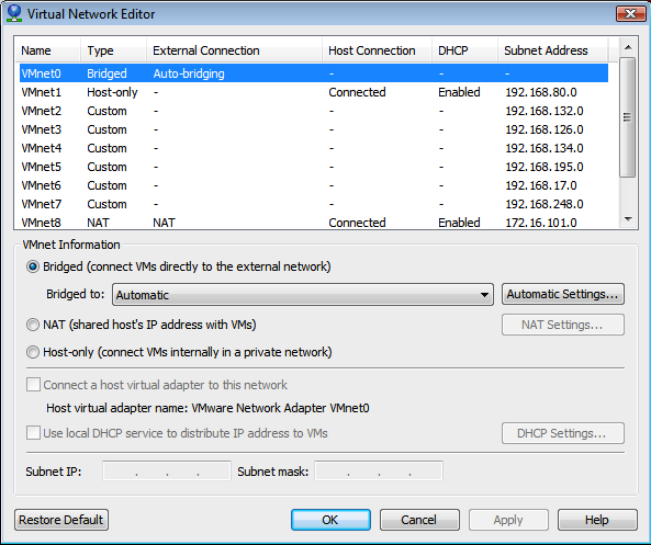 Adaptor yang dijembatani dapat ditautkan ke antarmuka fisik apa pun pada PC host Anda, termasuk antarmuka VLAN logis, (jika PC Host Anda mendukung VLAN). Jadi Anda dapat menautkan satu Antarmuka Virtual untuk mengatakan adaptor Ethernet Anda, dan yang lainnya ke adaptor Nirkabel Anda. Namun, untuk melakukan ini, Anda harus mematikan Bridging Otomatis di VMnet0 terlebih dahulu. [Catatan: setelah MENONAKTIFKAN Penghubung otomatis di VMnet0, Anda dapat menetapkan adaptor fisik ke antarmuka VMnet tertentu, lalu kembali ke VMnet0 dan mengaktifkan Penghubungan otomatis kembali!]. Penghubung otomatis itu spesial, dan akan menjembatani dirinya sendiri ke antarmuka fisik mana yang memberikan kesempatan terbaik untuk mencapai internet, dan hanya mungkin di VMnet0. Antarmuka VMnet0 Anda diatur untuk Penghubung Otomatis secara default.