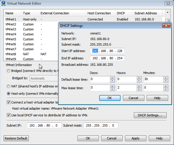 - Alamat IP server DCHP 192.168.80.254 (dari mana asalnya?) Juga berada di subnet yang sama dengan antarmuka VMnet8 dari PC host