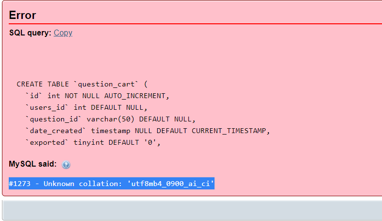 Tampilan error #1273 – Unknown collation: ‘utf8mb4_0900_ai_ci’